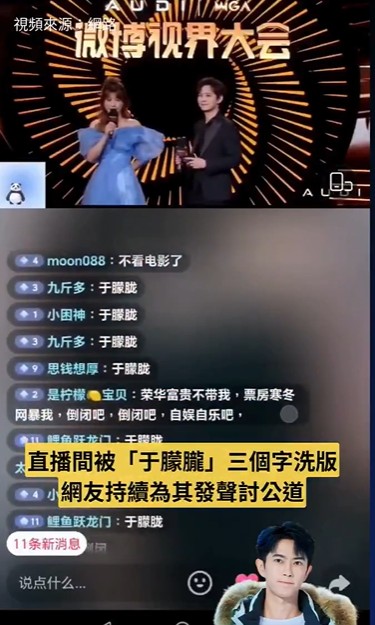 11月3日,“2025微博视界大会”在北京举行,期间失控,整个直播间被“于朦胧”三个字洗版,网友全程为其发声讨公道。网友:98位明星没有一位出来为于朦胧说一句公道话,还想让我们这些蝼蚁为他们的作品买单,那就是做梦,于朦胧案真相不出,从此以后不会为内娱贡献一分钱。