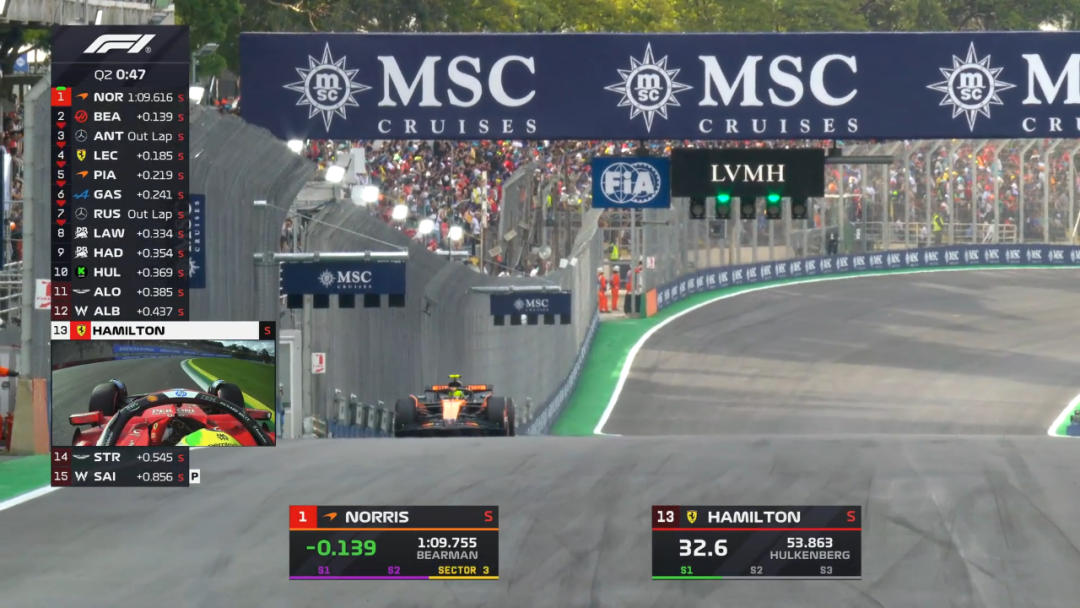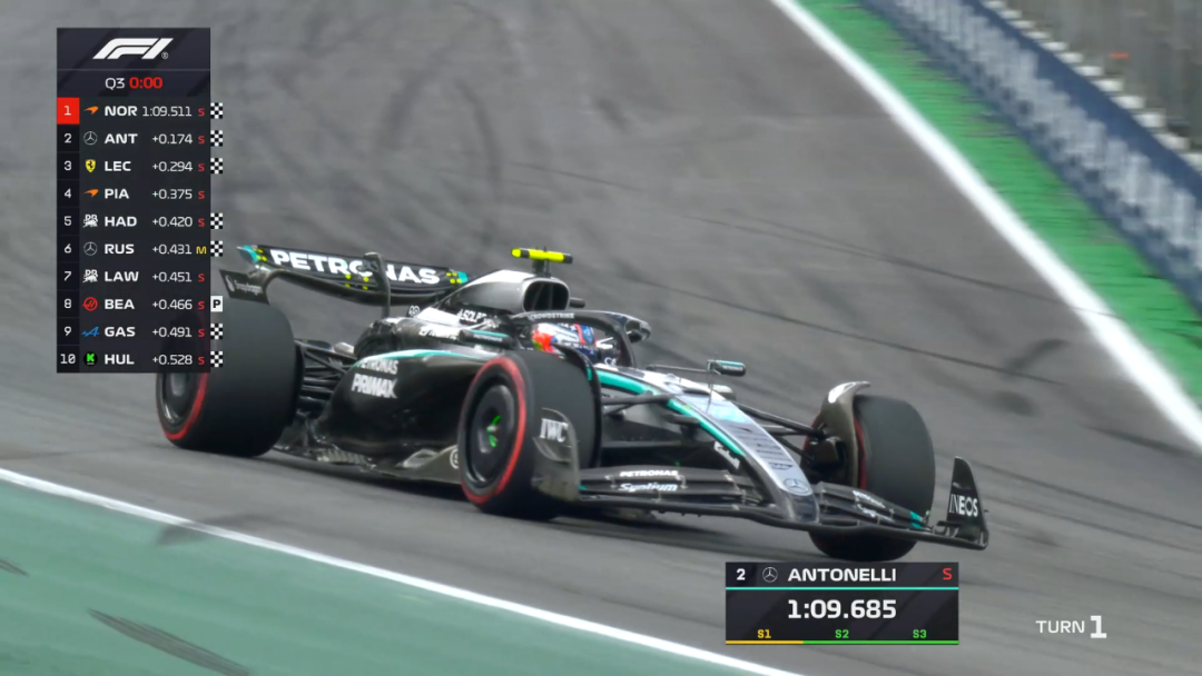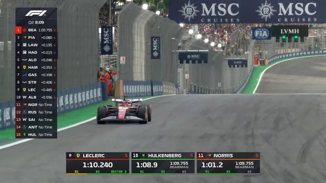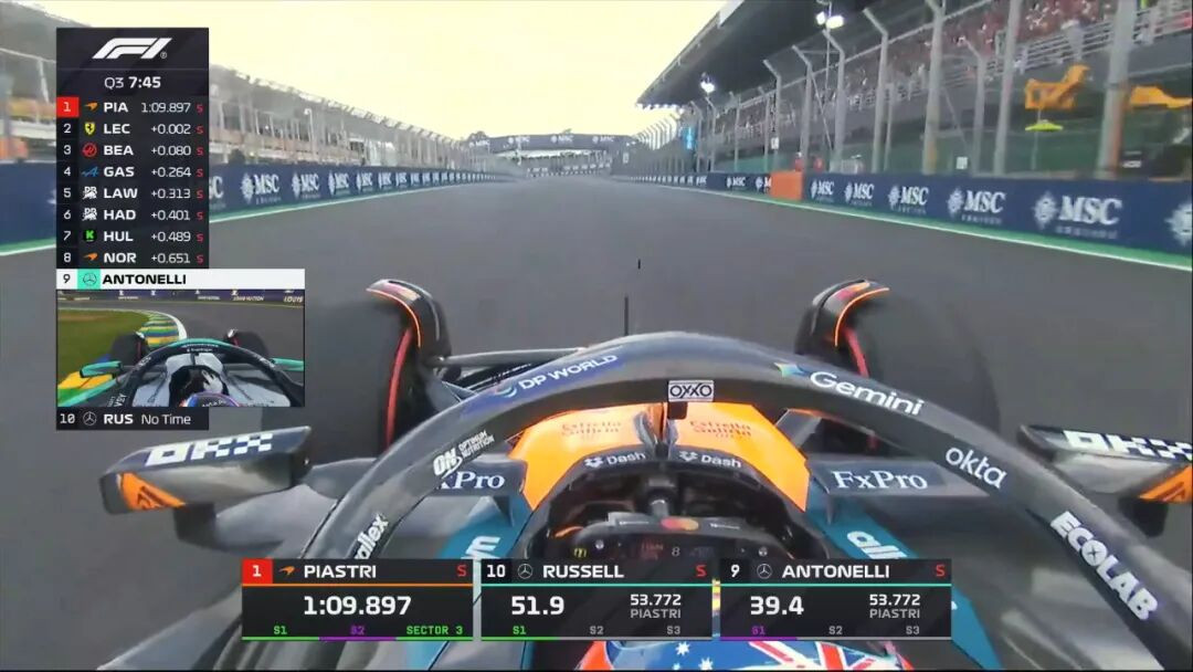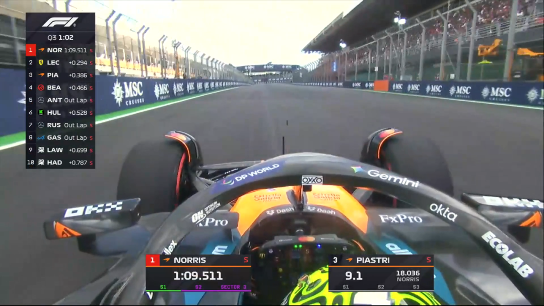 Q3首圈,皮亚斯特里领先勒克莱尔0.002秒夺得临时杆位。诺里斯在第一计时段失误,排在最后。
