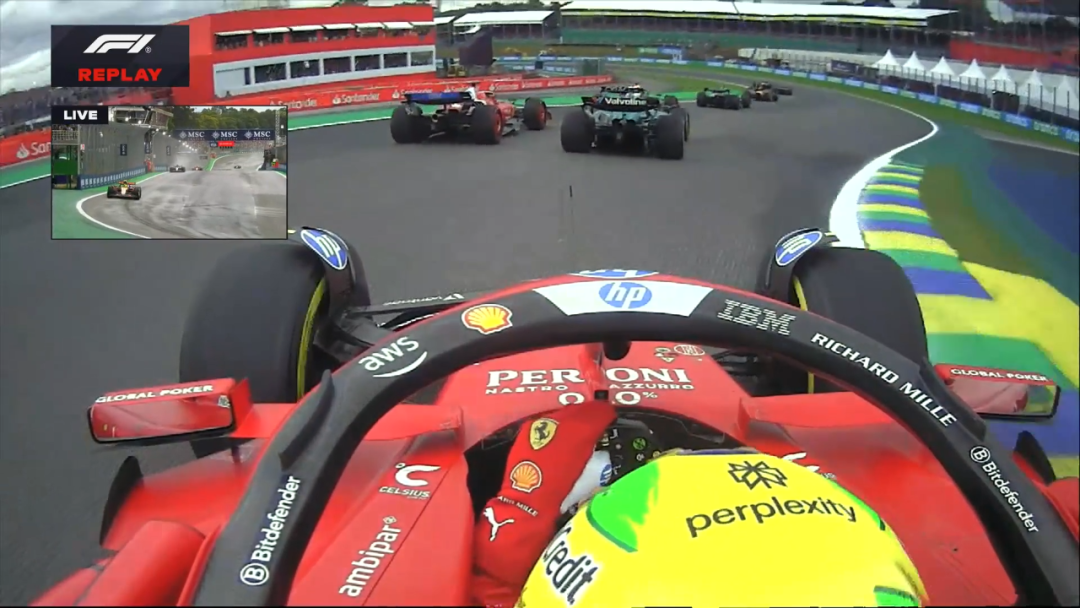 诺里斯使用软胎,安东内利、拉塞尔和维斯塔潘使用中性胎,阿隆索使用软胎,领先于两辆使用中性胎的法拉利车手。
