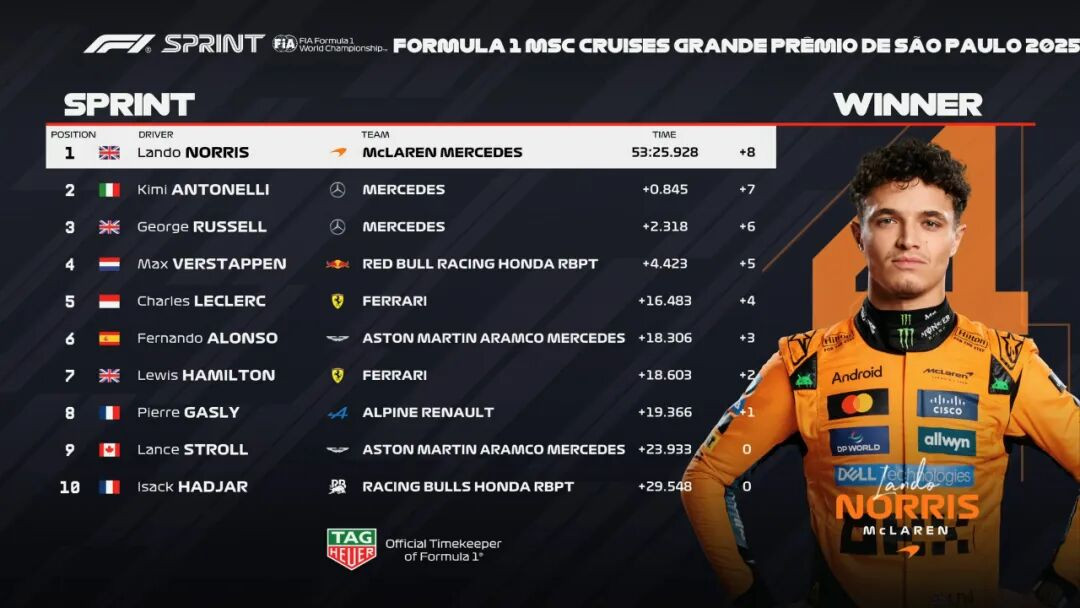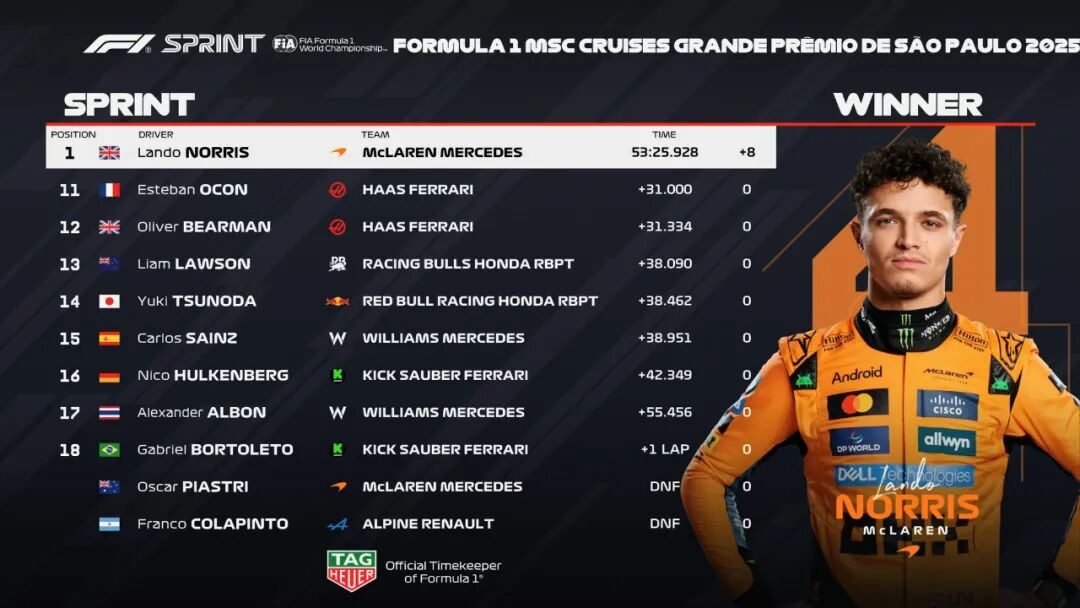 最终,诺里斯冲线夺得冠军,在积分榜上以9分优势领先皮亚斯特里。安东内利第二,拉塞尔第三。第四第五分别是维斯塔潘和勒克莱尔,身后是阿隆索、汉密尔顿、加斯利。