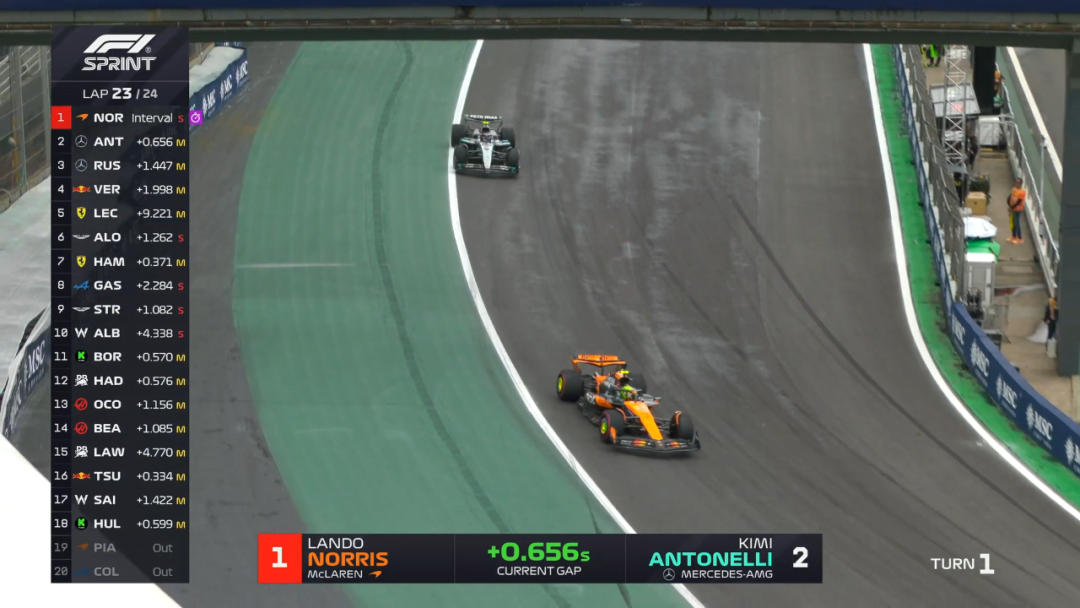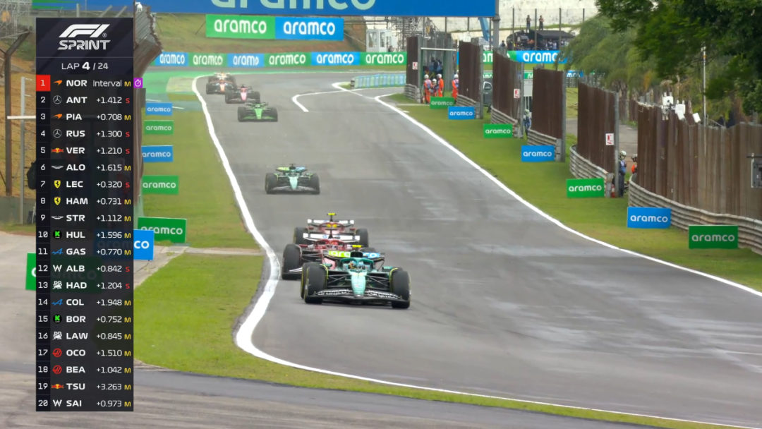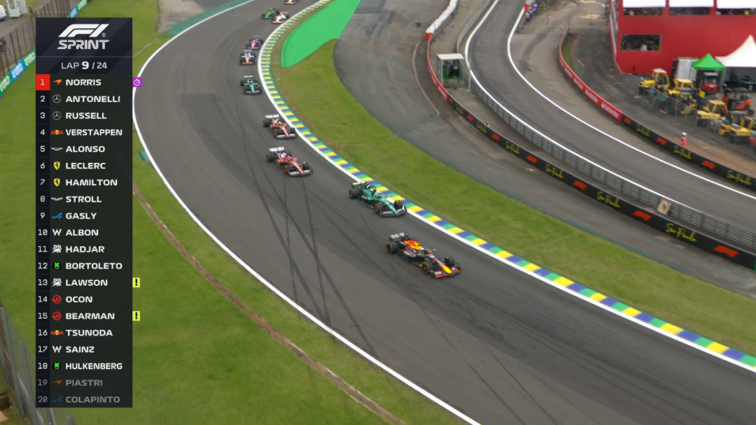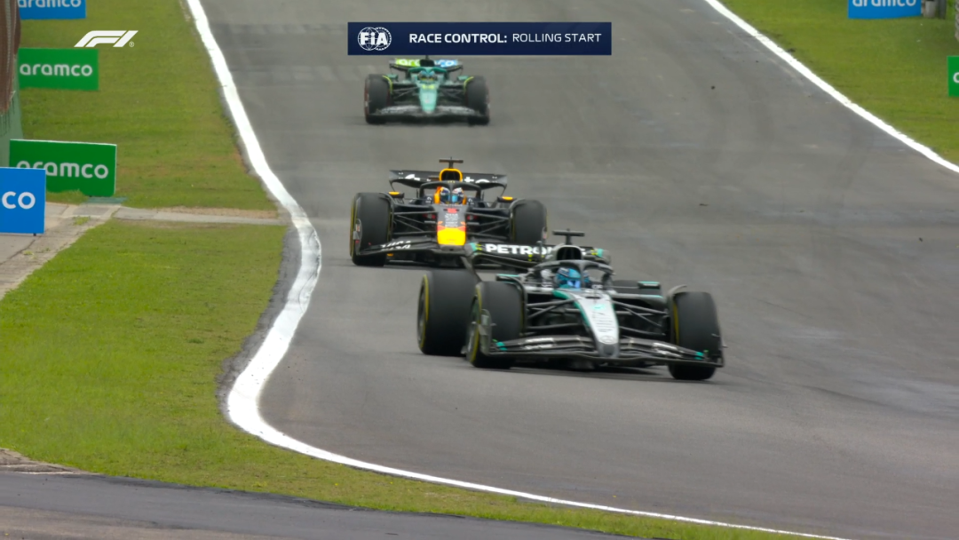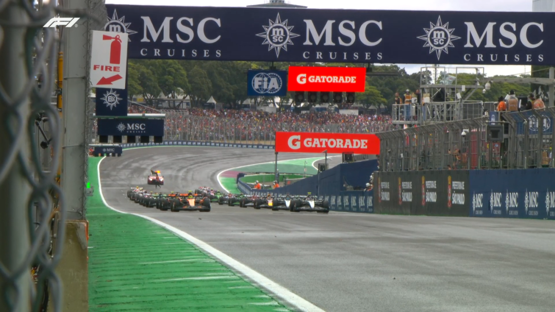 圣保罗大奖赛冲刺赛于周六晚上22:00分准时发车。赛前当地出现了降雨,但对赛道条件影响较小,车手们仍搭载干胎起步。