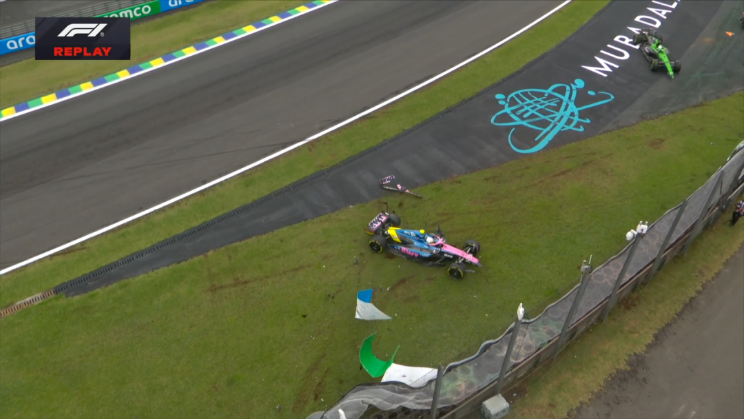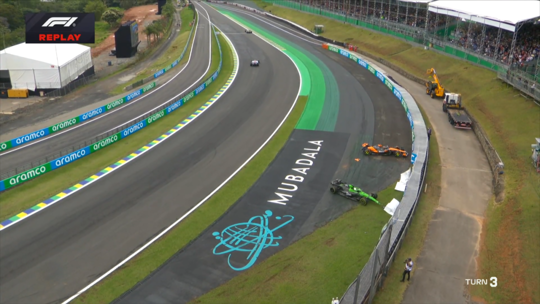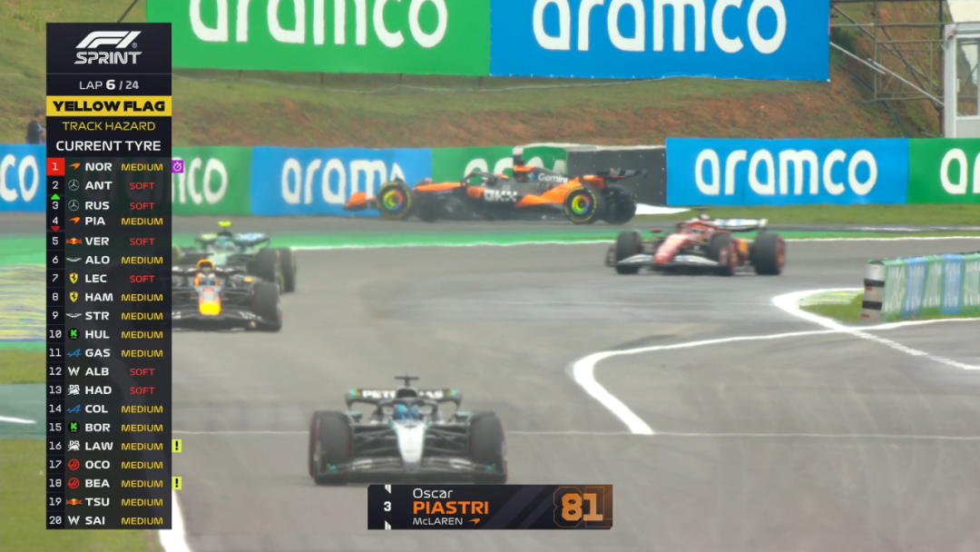 第六圈,场上出现黄旗。皮亚斯特里在三号弯压上路肩后打滑失控,撞上护墙。
