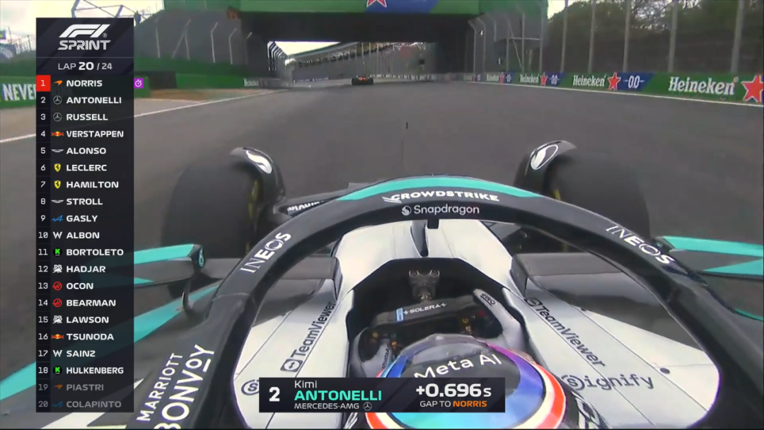 第二十圈,安东内利追进诺里斯DRS范围内。两个人已拉开与拉塞尔的间距。