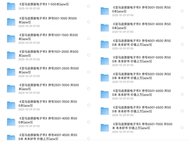 亚马逊原版电子书合集(30000册)是一份精心整理的高质量数字阅读资源库,覆盖了文学经典、畅销小说、学术着作、实用指南、历史传记、科幻奇幻等多个领域。本资源集合了来自亚马逊平台的 正版授权电子书,格式统一为MOBI,兼容Kindle及主流电子阅读器,为用户提供便捷、高清、无广告干扰的阅读体验。无论是深度阅读爱好者、学术研究者,还是普通读者,都能从中找到适合自己的内容。资源按字母顺序分卷整理,结构清晰,支持快速检索与分类阅读,极大提升了使用效率。