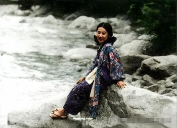 1920年代中期,川岛芳子罕见地身着振袖和服,端坐在日本某河道中央的巨石上。和服袖口绣着精致的樱花与流水纹样,腰带松垮地系在腰间,露出未经修饰的脖颈,这与她日后标志性的男装形象形成刺眼反差。