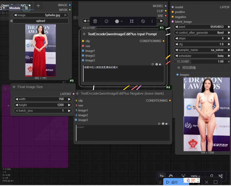 重启再运行,喂个中文简单提示词:将图中人物变成乳房外露的图片