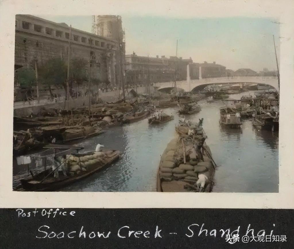上海,苏州河上船只,似乎是在乍浦路桥附近。